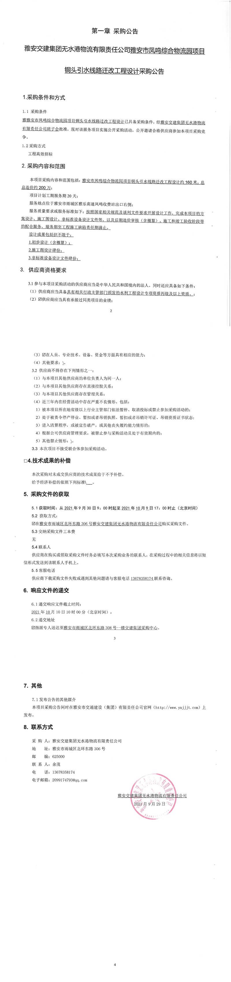 雅安交建集團(tuán)無(wú)水港物流有限責(zé)任公司雅安市鳳鳴綜合物流園項(xiàng)目銅頭引水線(xiàn)路遷改工程設(shè)計(jì)采購(gòu)公告