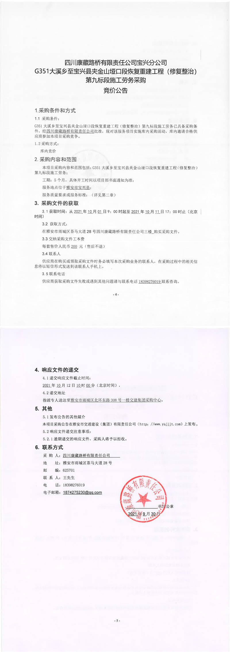 四川康藏路橋有限責(zé)任公司寶興分公司G351大溪鄉(xiāng)至寶興縣夾金山埡口段恢復(fù)重建工程(修復(fù)整治)第九標(biāo)段施工勞務(wù)采購競價公告