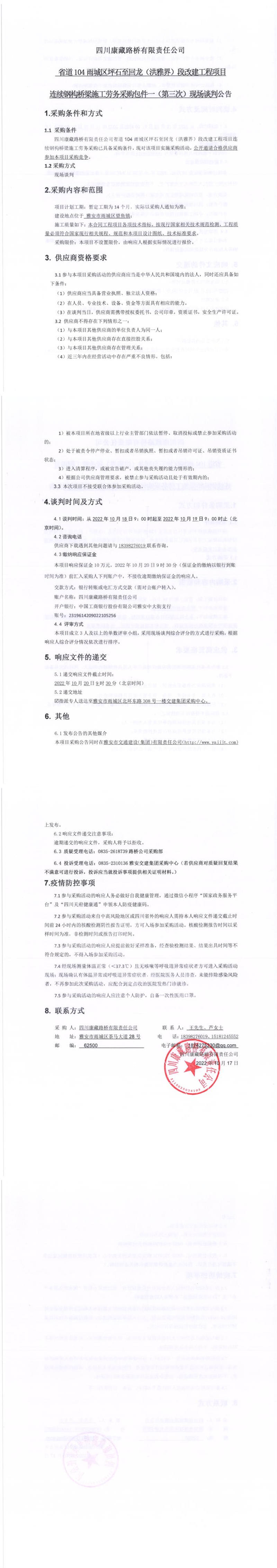 四川康藏路橋有限責任公司省道104雨城區(qū)坪石至回龍(洪雅界)段改建工程項目連續(xù)鋼構橋梁施工勞務采購包件一(第三次)現(xiàn)場談判公告