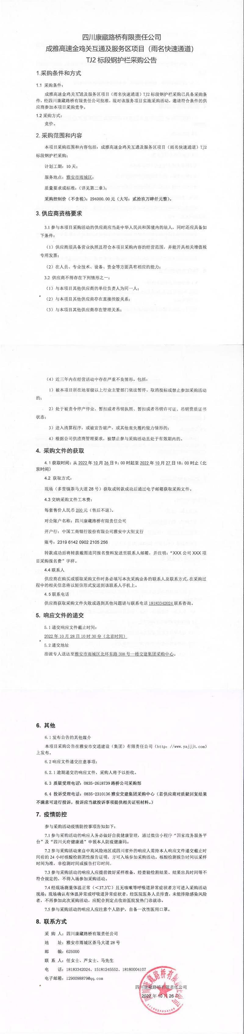 四川康藏路橋有限責(zé)任公司成雅高速金雞關(guān)互通及服務(wù)區(qū)項目(雨名快速通道)TJ2標段鋼護欄采購公告