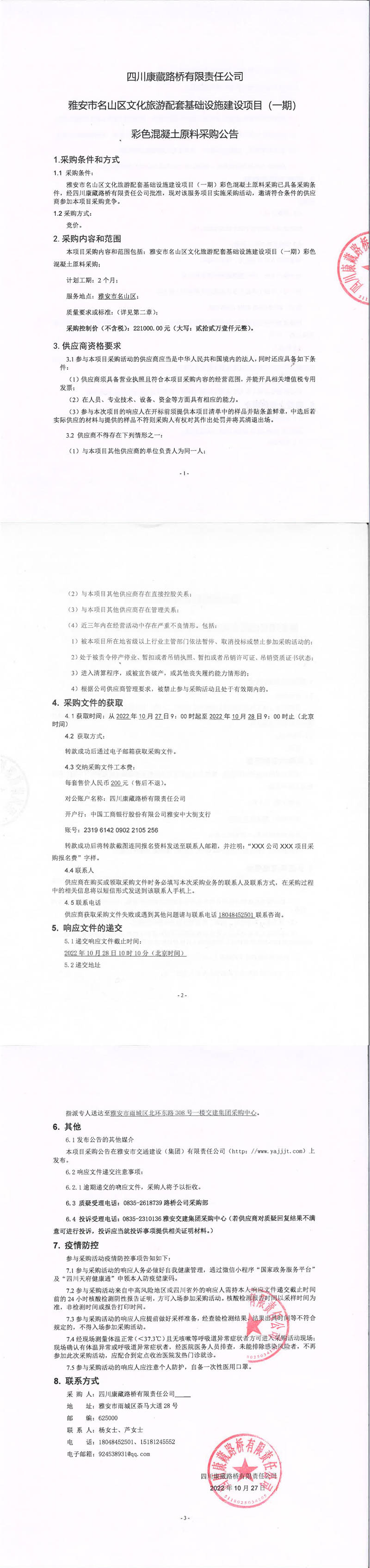 四川康藏路橋有限責(zé)任公司雅安市名山區(qū)文化旅游配套基礎(chǔ)設(shè)施建設(shè)項(xiàng)目(一期)彩色混凝土原料采購(gòu)公告