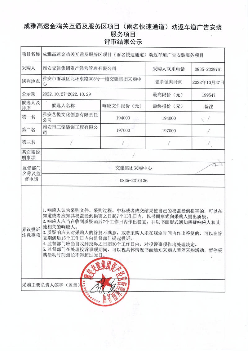 雅安交建集團(tuán)資產(chǎn)經(jīng)營(yíng)管理有限公司成雅高速金雞關(guān)互通及服務(wù)區(qū)項(xiàng)目(雨名快速通道)勸返車(chē)道廣告安裝服務(wù)項(xiàng)目評(píng)審結(jié)果公示
