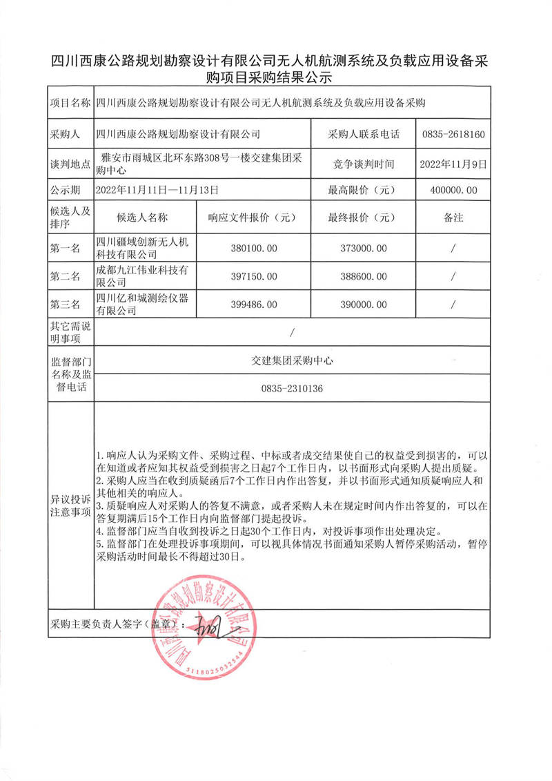 四川西康公路規(guī)劃勘察設(shè)計有限公司無人機航測系統(tǒng)及負(fù)載應(yīng)用設(shè)備采購項目采購結(jié)果公示