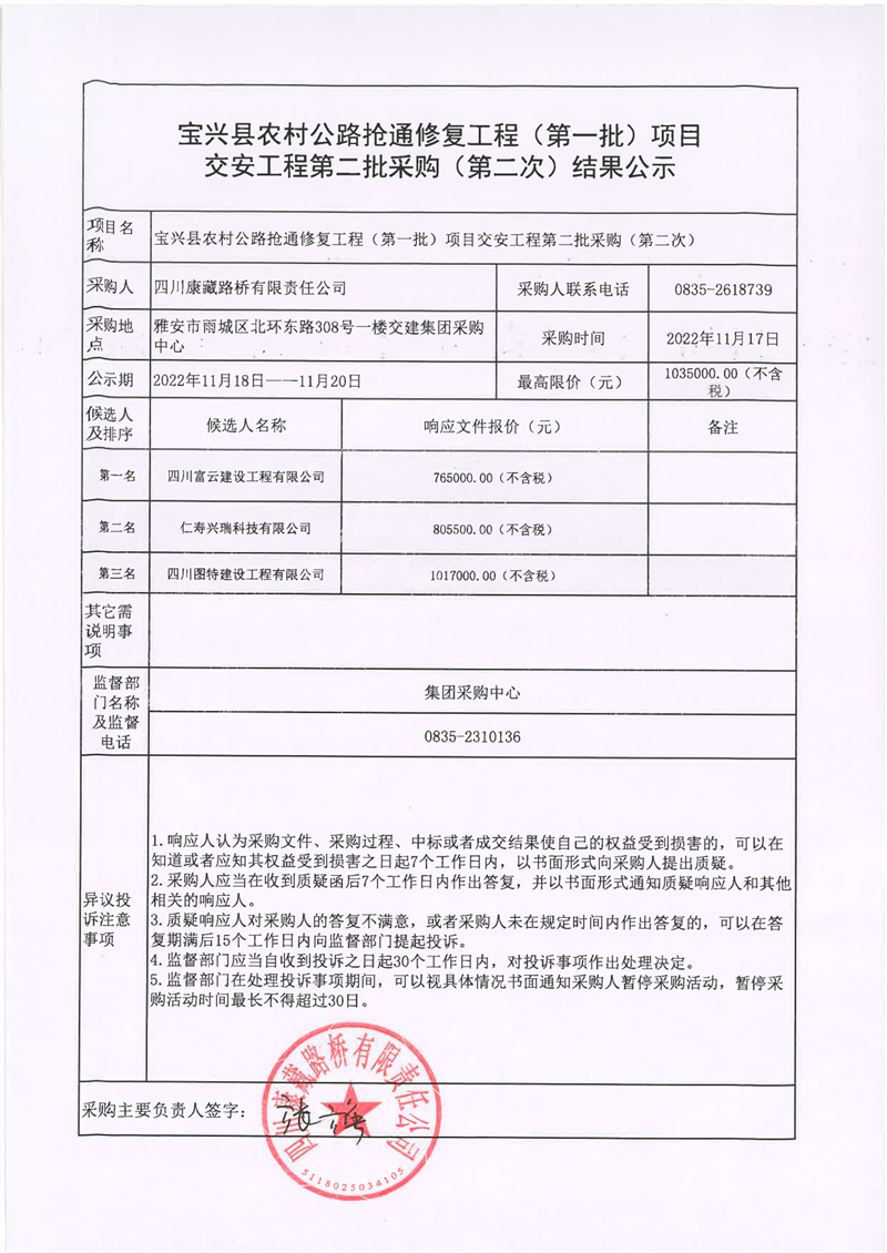 四川康藏路橋有限責(zé)任公司寶興縣農(nóng)村公路搶通修復(fù)工程(第一批)項(xiàng)目交安工程第二批采購(第二次)結(jié)果公示