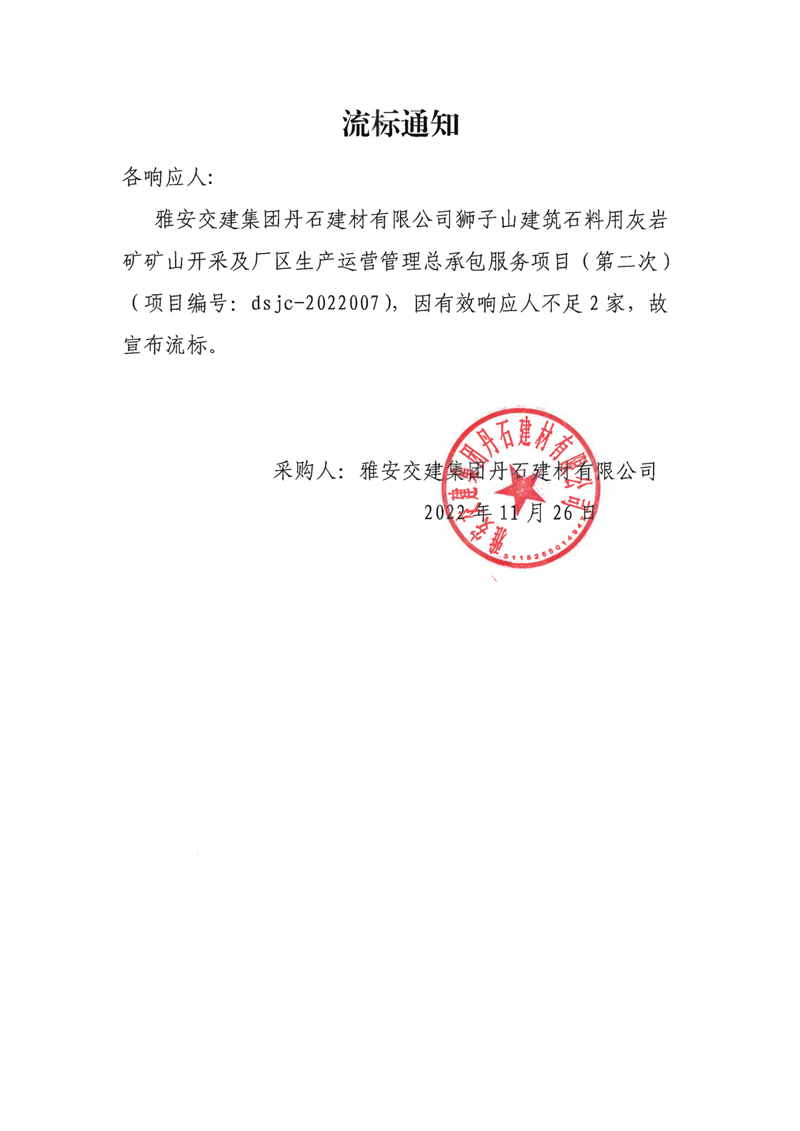 雅安交建集團丹石建材有限公司獅子山建筑石料用灰?guī)r礦礦山開采及廠區(qū)生產(chǎn)運營管理總承包服務(wù)項目(第二次)流標通知