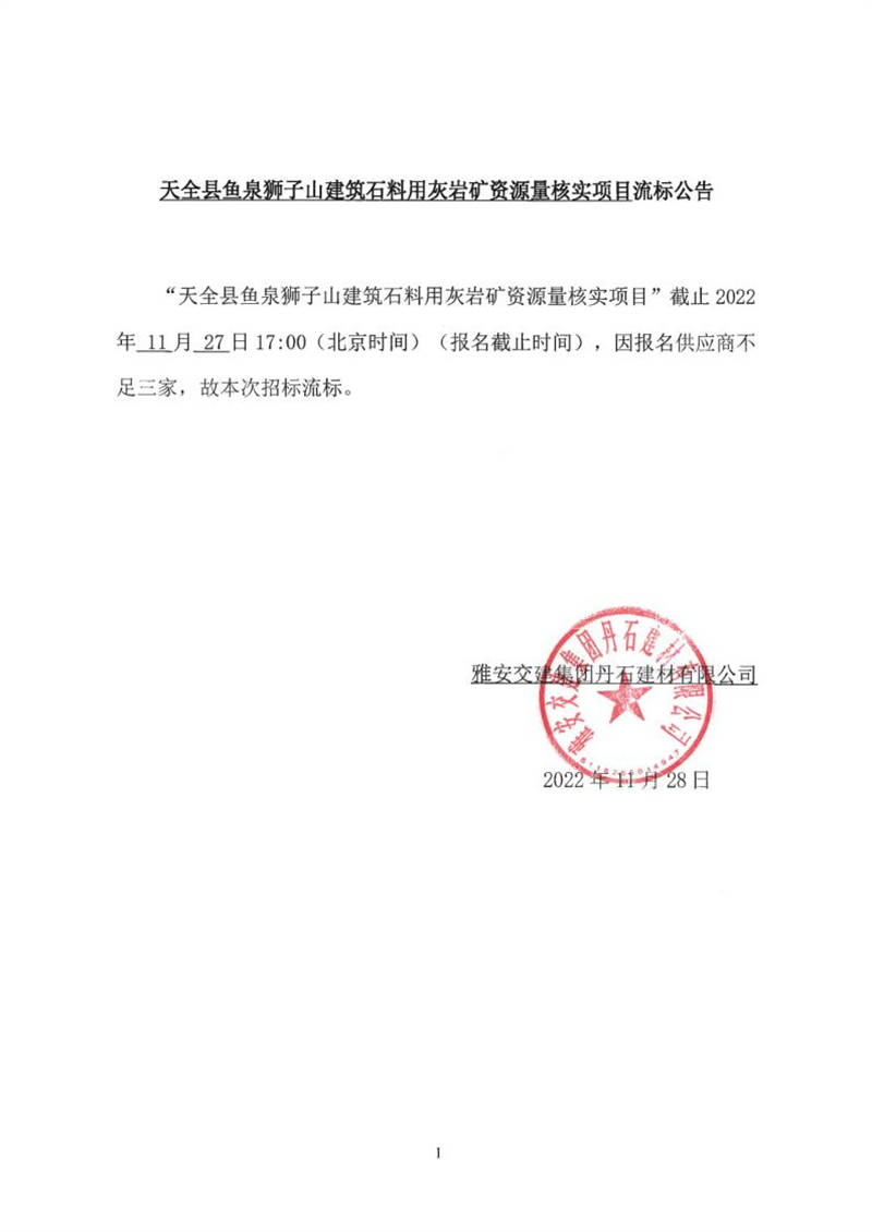雅安交建集團丹石建材有限公司天全縣魚泉獅子山建筑石料用灰?guī)r礦資源量核實項目流標公告