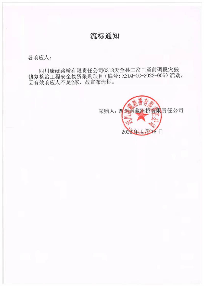 四川康藏路橋有限責(zé)任公司G318天全縣三岔口至前碉段災(zāi)毀修復(fù)整治工程安全物資采購項目流標通知