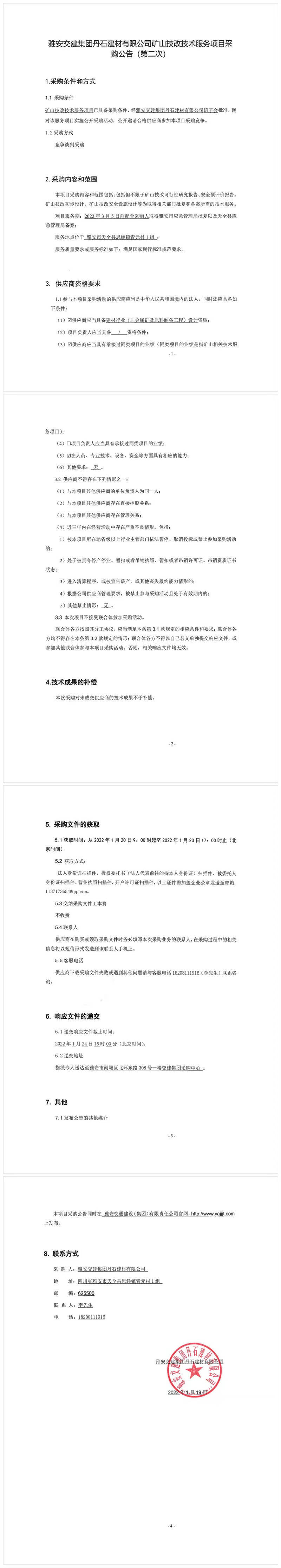 雅安交建集團(tuán)丹石建材有限公司礦山技改技術(shù)服務(wù)項(xiàng)目采購公告(第二次)