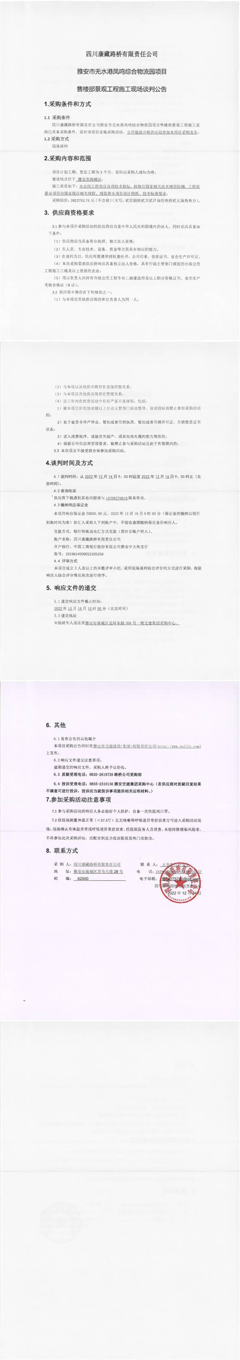 四川康藏路橋有限責(zé)任公司雅安市無水港鳳鳴綜合物流園項(xiàng)目售樓部景觀工程施工現(xiàn)場(chǎng)談判公告