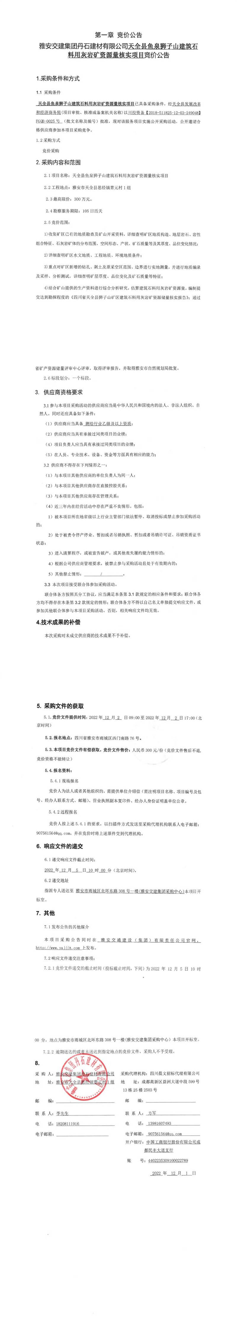 雅安交建集團(tuán)丹石建材有限公司天全縣魚泉獅子山建筑石料用灰?guī)r礦資源量核實(shí)項目競價公告