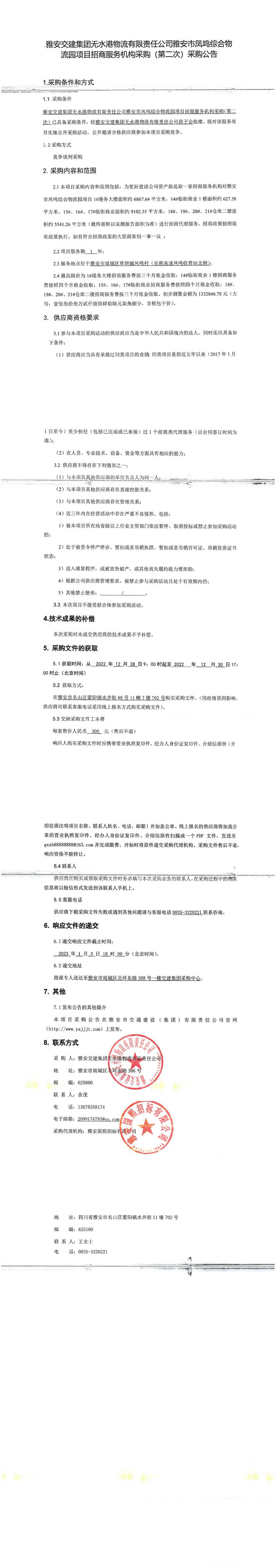 雅安交建集團(tuán)無水港物流有限責(zé)任公司雅安市鳳鳴綜合物流園項(xiàng)目招商服務(wù)機(jī)構(gòu)采購(gòu)(第二次)采購(gòu)公告
