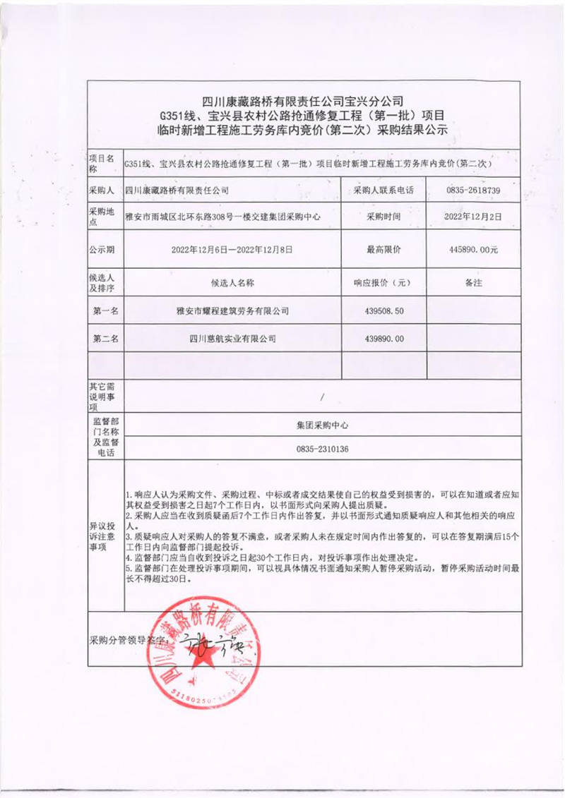 四川康藏路橋有限責(zé)任公司寶興分公司G351線、寶興縣農(nóng)村公路搶通修復(fù)工程(第一批)項(xiàng)目臨時(shí)新增工程施工勞務(wù)庫內(nèi)競價(jià)(第二次)采購結(jié)果公示