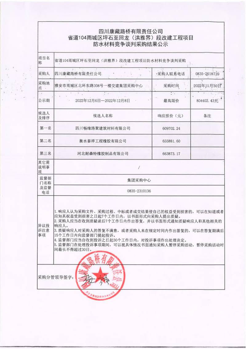 四川康藏路橋有限責(zé)任公司省道104雨城區(qū)坪石至回龍(洪雅界)段改建工程項目防水材料競爭談判采購結(jié)果公示