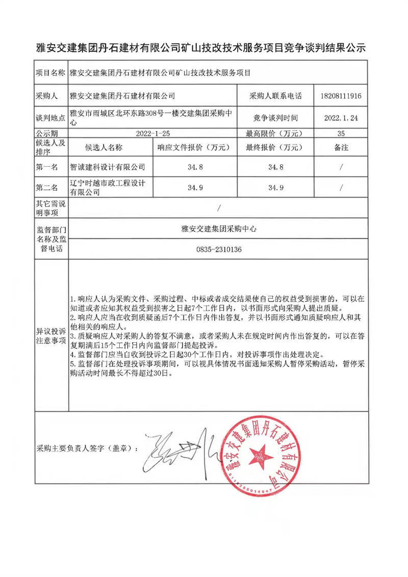 雅安交建集團(tuán)丹石建材有限公司礦山技改技術(shù)服務(wù)項目競爭談判結(jié)果公示
