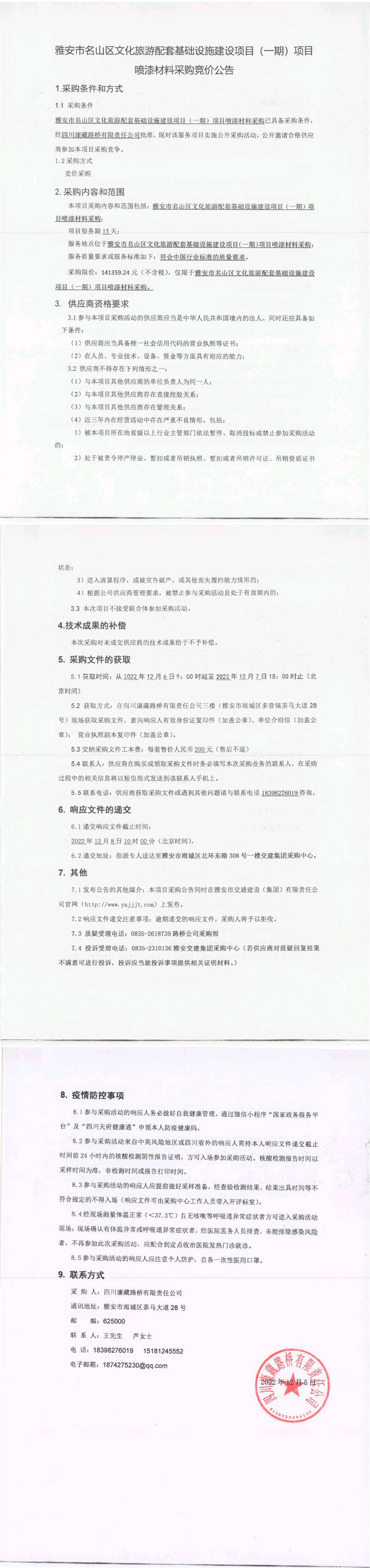 四川康藏路橋有限責(zé)任公司雅安市名山區(qū)文化旅游配套基礎(chǔ)設(shè)施建設(shè)項(xiàng)目(一期)項(xiàng)目噴漆材料采購競價(jià)公告
