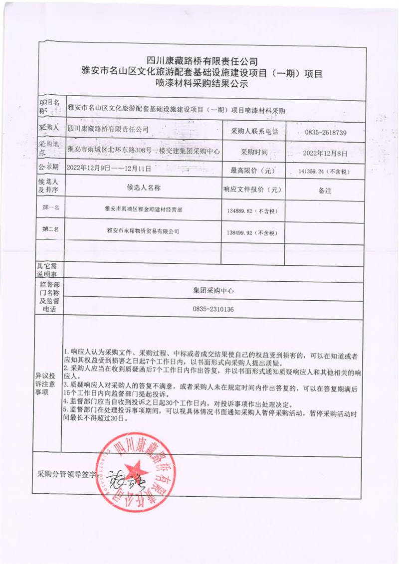 四川康藏路橋有限責(zé)任公司雅安市名山區(qū)文化旅游配套基礎(chǔ)設(shè)施建設(shè)項(xiàng)目(一期)項(xiàng)目噴漆材料采購(gòu)結(jié)果公示
