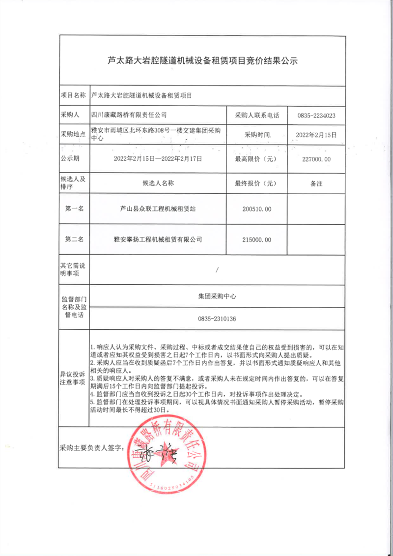 四川康藏路橋有限責(zé)任公司蘆太路大巖腔隧道機械設(shè)備租賃項目競價結(jié)果公示