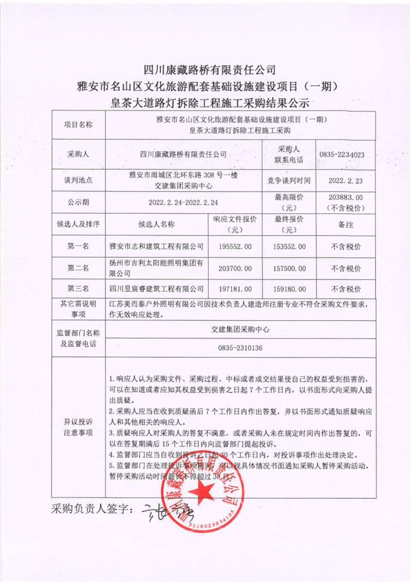 四川康藏路橋有限責(zé)任公司雅安市名山區(qū)文化旅游配套基礎(chǔ)設(shè)施建設(shè)項目(一期)皇茶大道路燈拆除工程施工采購結(jié)果公示