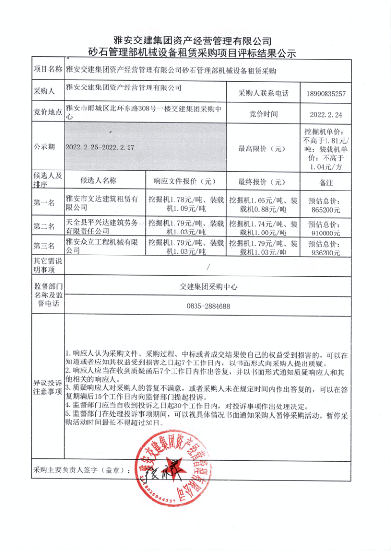 雅安交建集團資產(chǎn)經(jīng)營管理有限公司砂石管理部機械設(shè)備租賃采購項目評標(biāo)結(jié)果公示