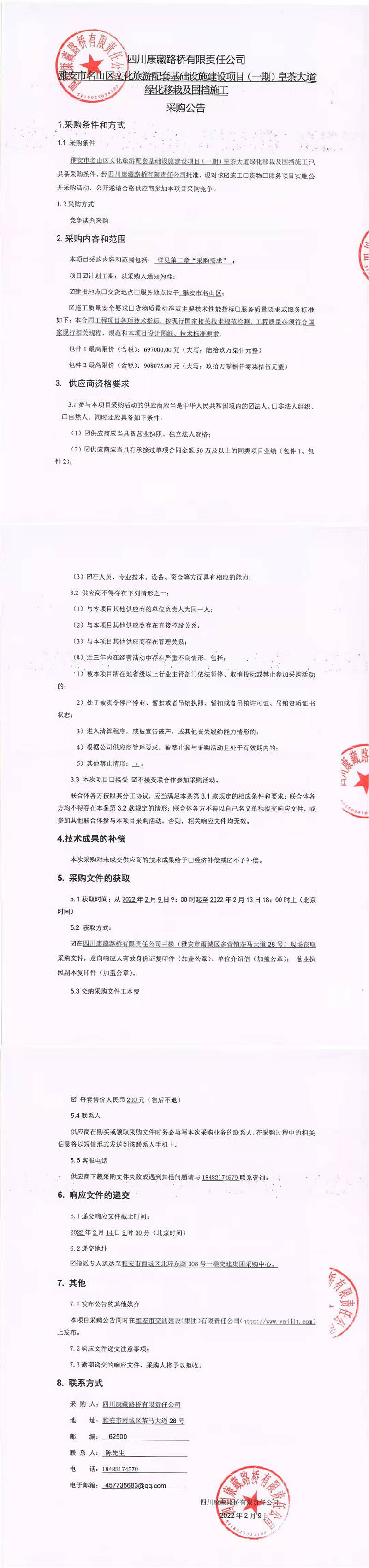 四川康藏路橋有限責(zé)任公司雅安市名山區(qū)文化旅游配套基礎(chǔ)設(shè)施建設(shè)項(xiàng)目(一期)皇茶大道綠化移栽及圍擋施工采購公告