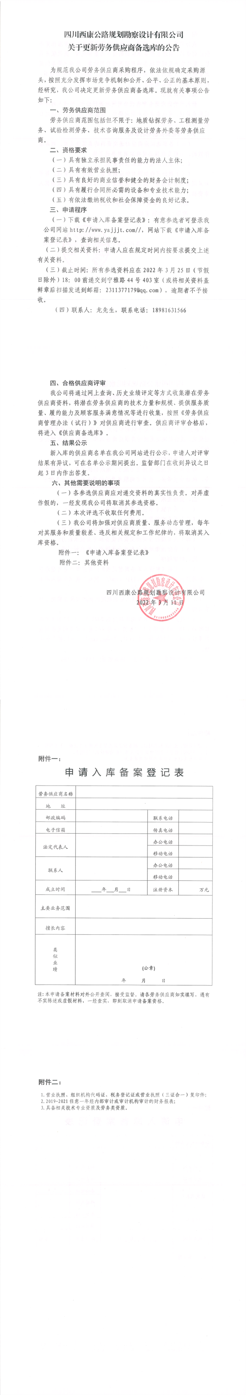 四川西康公路規(guī)劃勘察設(shè)計(jì)有限公司關(guān)于更新勞務(wù)供應(yīng)商備選庫的公告