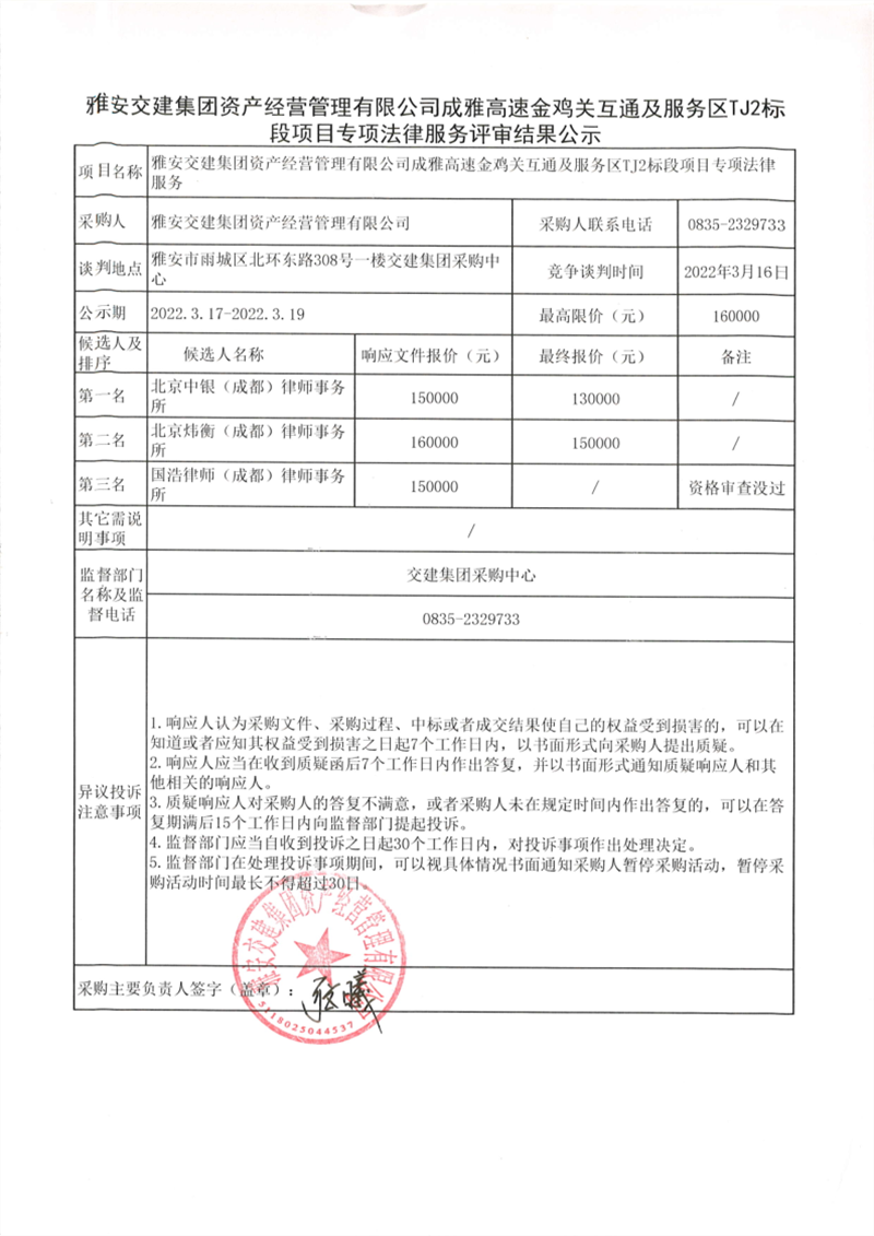 雅安交建集團(tuán)資產(chǎn)經(jīng)營管理有限公司成雅高速金雞關(guān)互通及服務(wù)區(qū)TJ2標(biāo)段項(xiàng)目專項(xiàng)法律服務(wù)評(píng)審結(jié)果公示