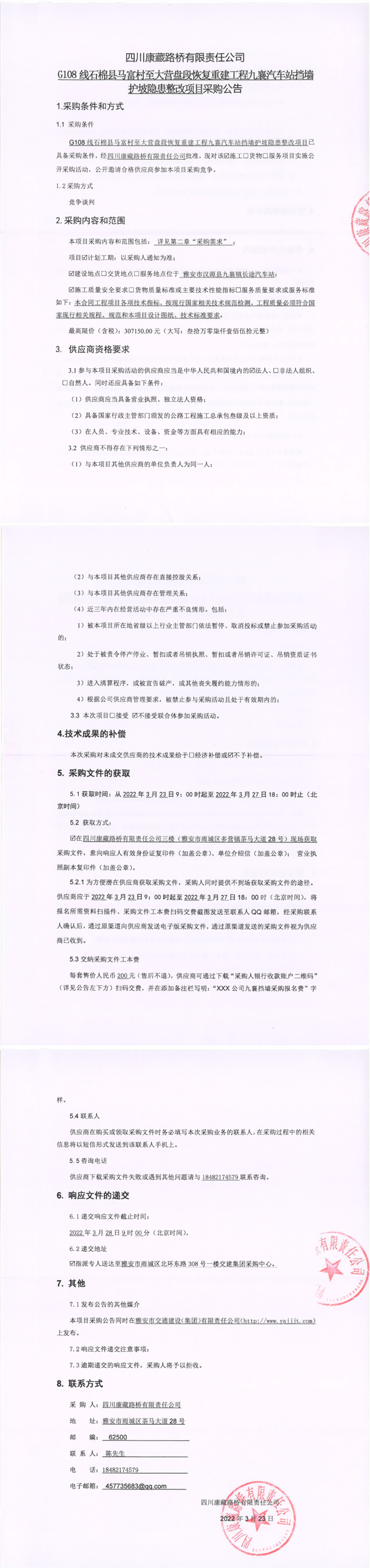 四川康藏路橋有限責(zé)任公司G108線石棉縣馬福村至大營盤段恢復(fù)重建工程九襄汽車站擋墻護(hù)坡隱患整改項(xiàng)目采購公告