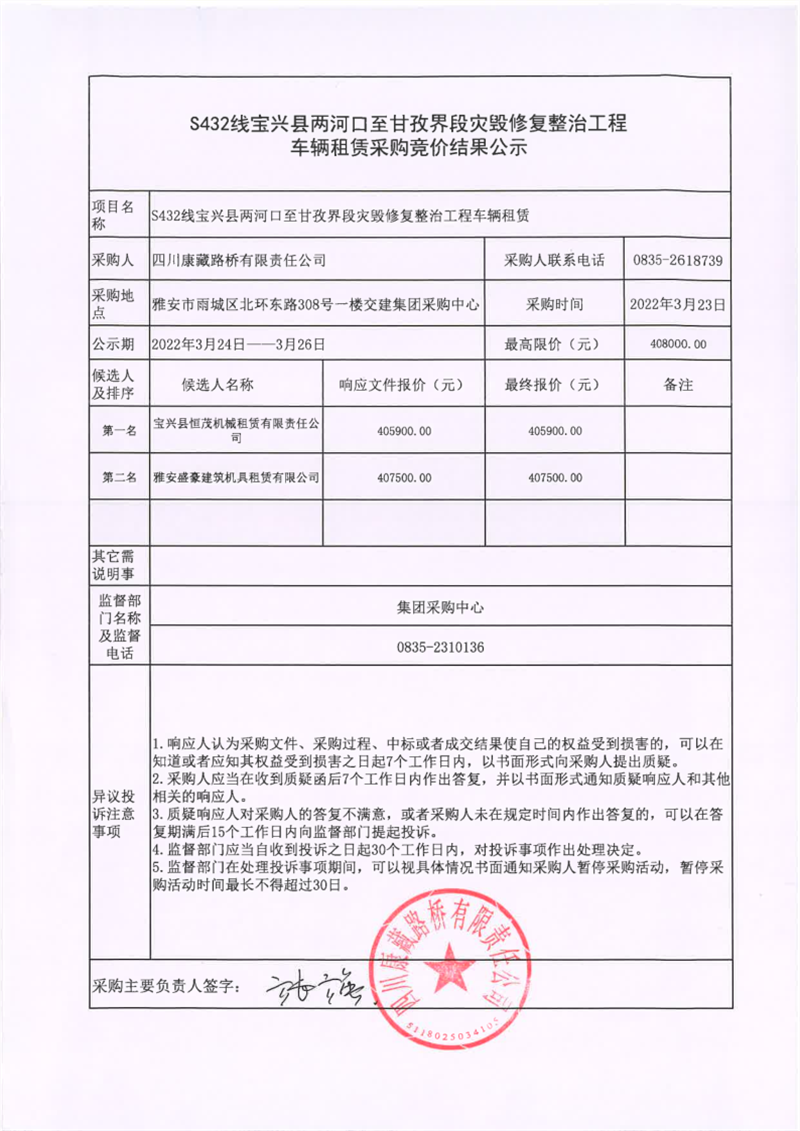 四川康藏路橋有限責(zé)任公司S432線寶興縣兩河口至甘孜界段災(zāi)毀修復(fù)整治工程車輛租賃采購(gòu)競(jìng)價(jià)結(jié)果公示