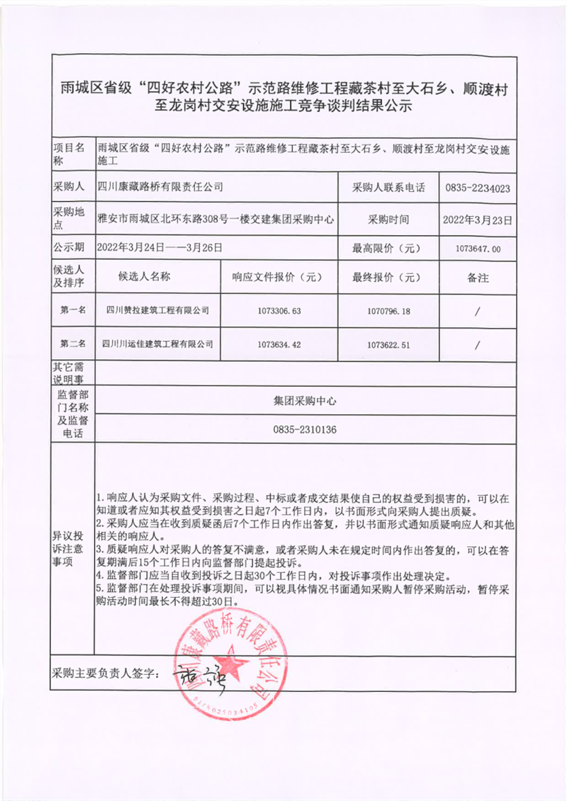 四川康藏路橋有限責(zé)任公司雨城區(qū)省級(jí)“四好農(nóng)村公路”示范路維修工程藏茶村至大石鄉(xiāng)、順渡村至龍崗村交安設(shè)施施工競(jìng)爭(zhēng)談判結(jié)果公示