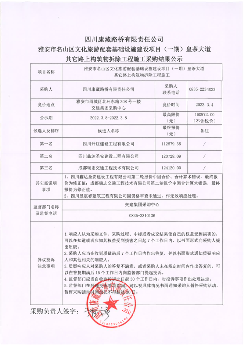 四川康藏路橋有限責任公司雅安市名山區(qū)文化旅游配套基礎(chǔ)設施建設項目(一期)皇茶大道其它路上構(gòu)筑物拆除工程施工采購結(jié)果公示