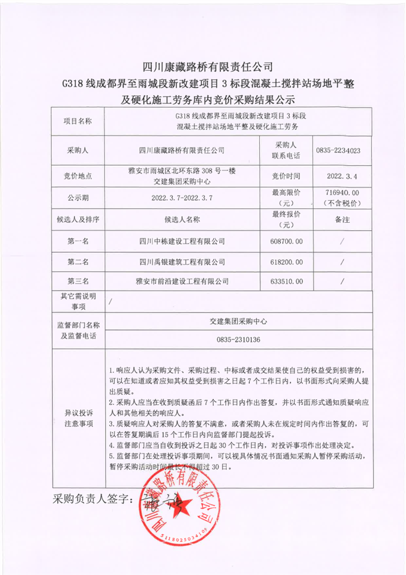 四川康藏路橋有限責(zé)任公司G318線成都界至雨城段新改建項(xiàng)目3標(biāo)段混凝土攪拌站場(chǎng)地平整及硬化施工勞務(wù)庫內(nèi)競(jìng)價(jià)采購(gòu)結(jié)果公示
