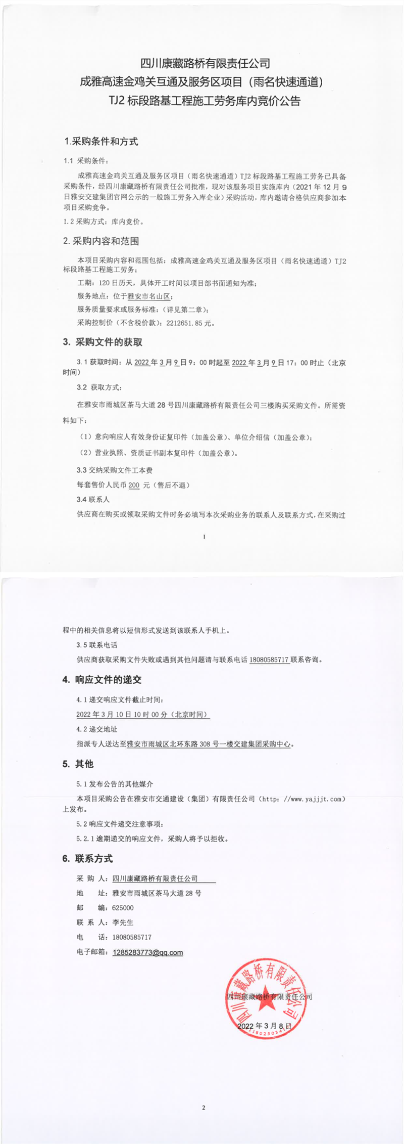 四川康藏路橋有限責(zé)任公司成雅高速金雞關(guān)互通及服務(wù)區(qū)項(xiàng)目(雨名快速通道)TJ2標(biāo)段路基工程施工勞務(wù)庫(kù)內(nèi)競(jìng)價(jià)公告