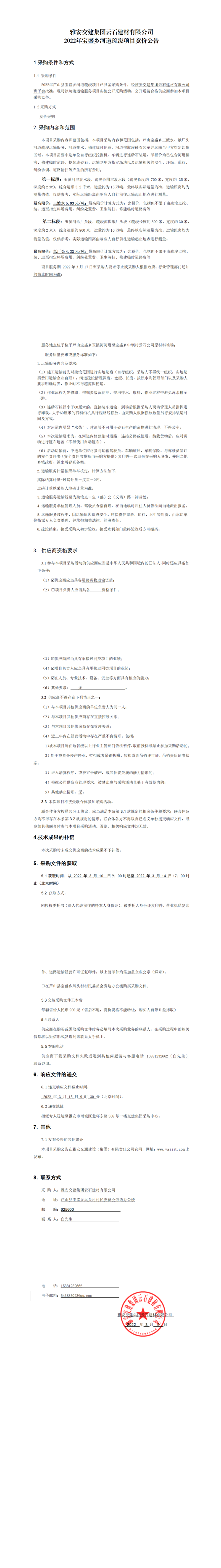 雅安交建集團(tuán)云石建材有限公司2022年寶盛鄉(xiāng)河道疏浚項(xiàng)目競(jìng)價(jià)公告