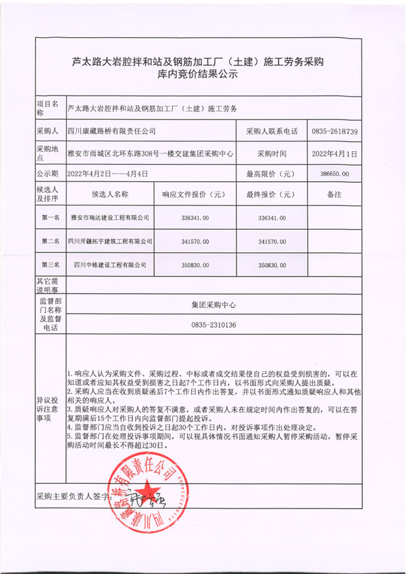四川康藏路橋有限責(zé)任公司蘆太路大巖腔拌和站及鋼筋加工廠(土建)施工勞務(wù)采購(gòu)庫(kù)內(nèi)競(jìng)價(jià)結(jié)果公示
