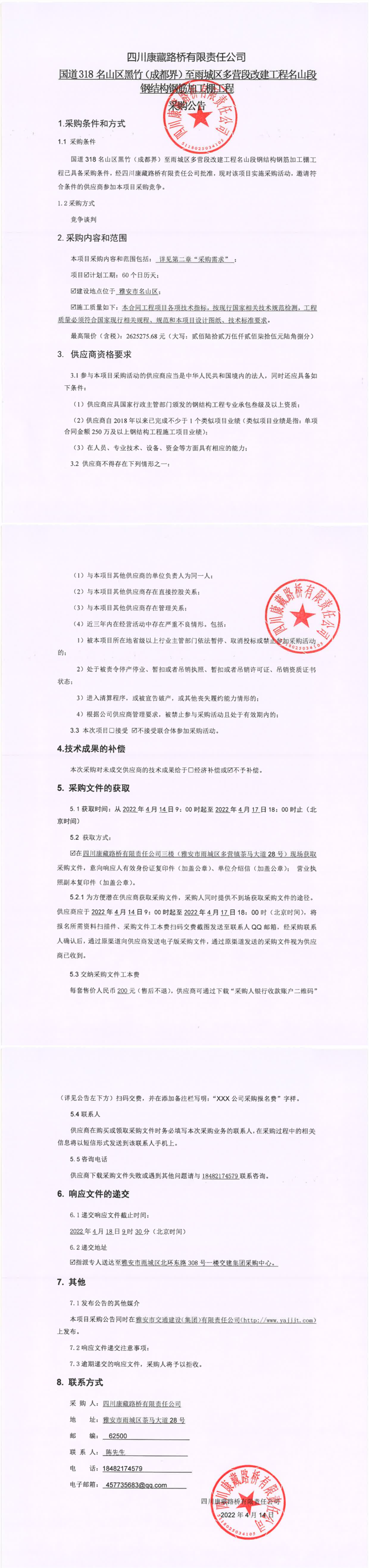 四川康藏路橋有限責任公司國道318名山區(qū)黑竹(成都界)至雨城區(qū)多營段改建工程名山段鋼結構鋼筋加工棚工程采購公告