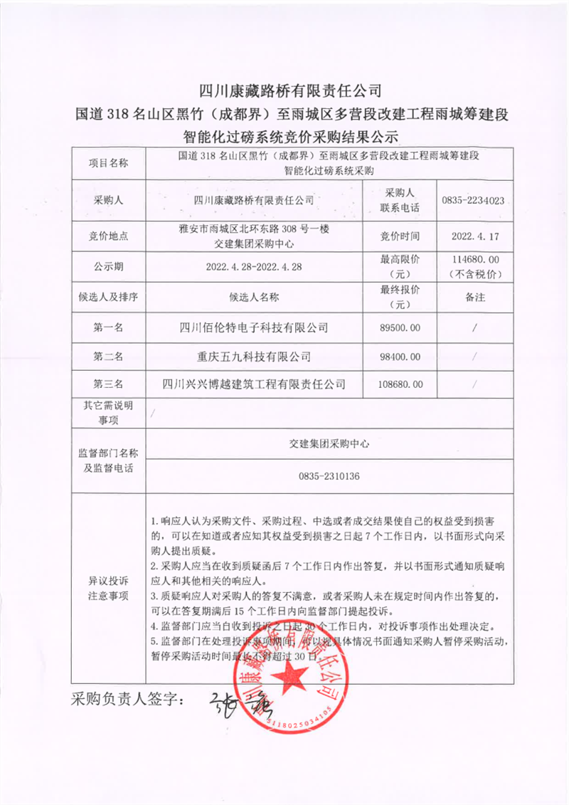 四川康藏路橋有限責任公司國道318名山區(qū)黑竹(成都界)至雨城區(qū)多營段改建工程雨城籌建段智能化過磅系統(tǒng)競價采購結果公示