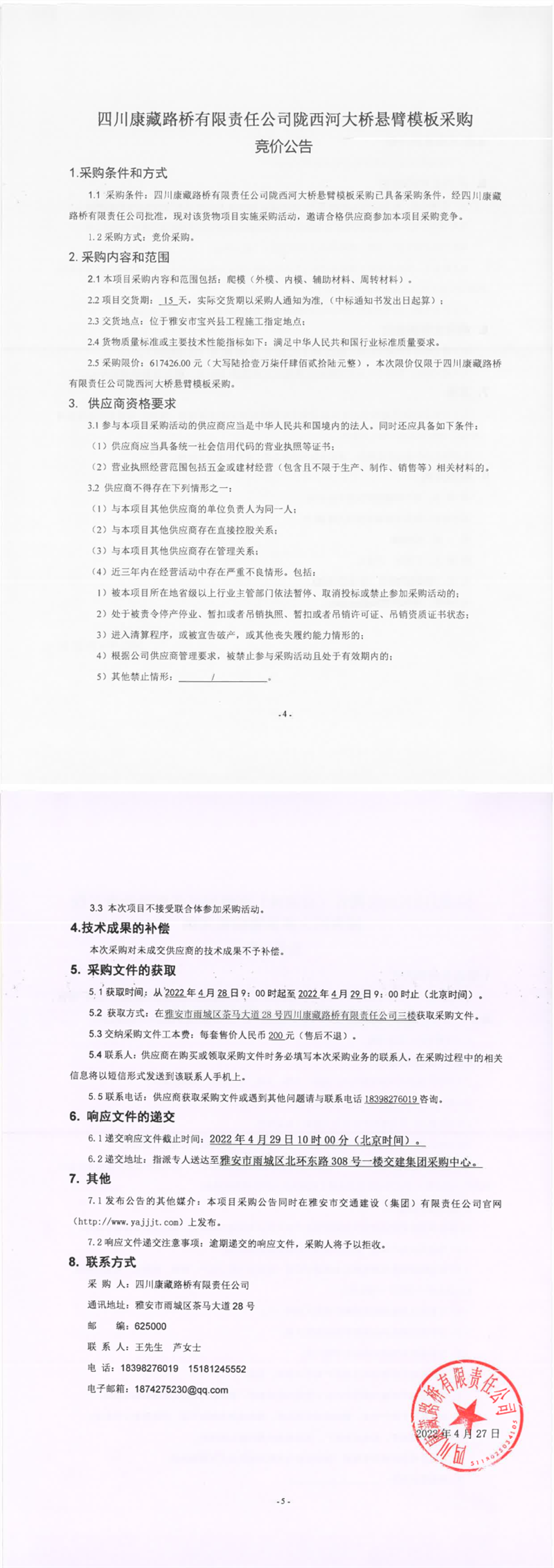 四川康藏路橋有限責(zé)任公司隴西河大橋懸臂模板采購(gòu)競(jìng)價(jià)公告