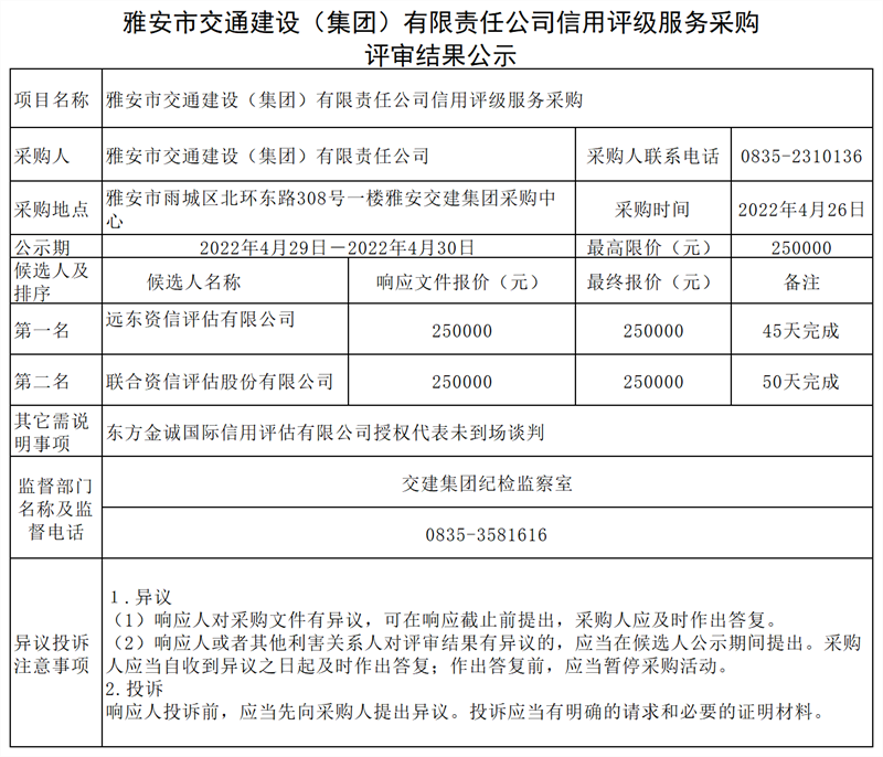 雅安市交通建設(shè)(集團)有限責任公司信用評級服務(wù)采購評審結(jié)果公示