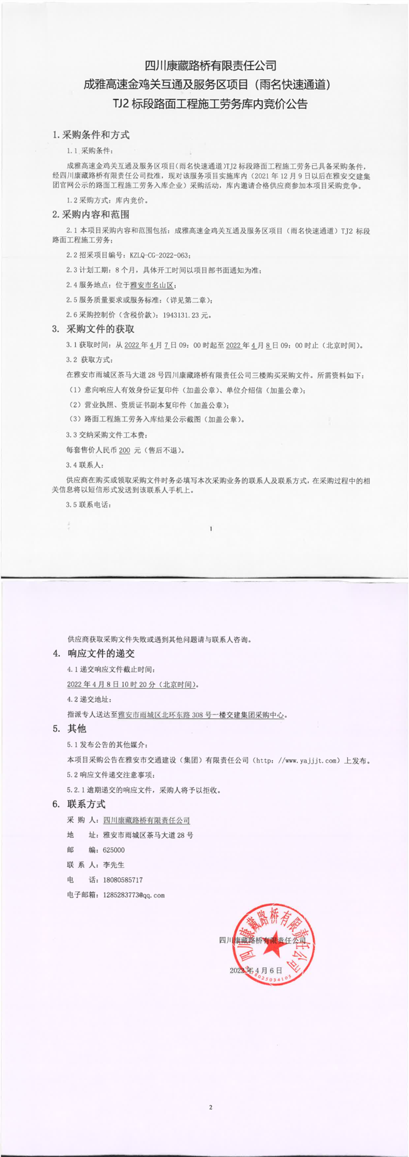 四川康藏路橋有限責(zé)任公司成雅高速金雞關(guān)互通及服務(wù)區(qū)項(xiàng)目(雨名快速通道)TJ2標(biāo)段路面工程施工勞務(wù)庫內(nèi)競(jìng)價(jià)公告
