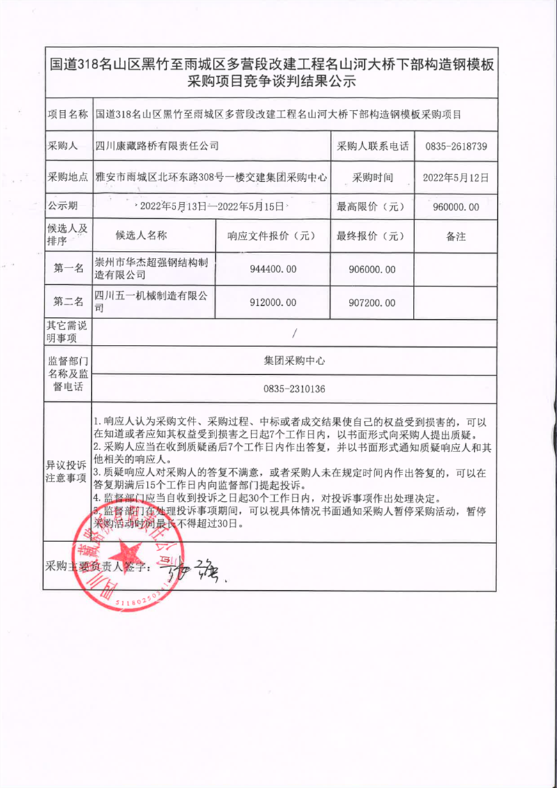 四川康藏路橋有限責(zé)任公司國(guó)道318名山區(qū)黑竹至雨城區(qū)多營(yíng)段改建工程名山河大橋下部構(gòu)造鋼模板采購項(xiàng)目競(jìng)爭(zhēng)談判結(jié)果公示