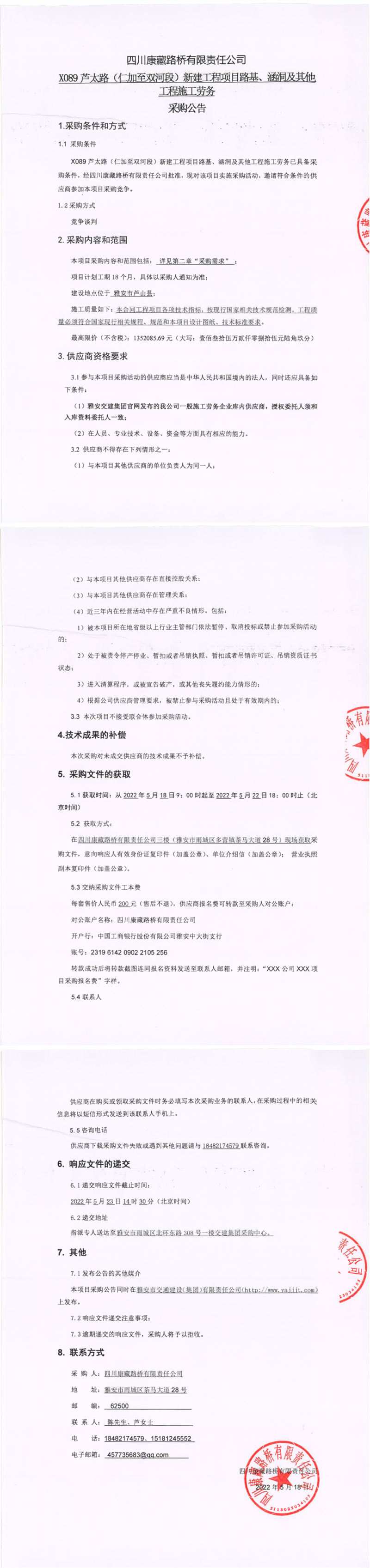 四川康藏路橋有限責(zé)任公司X089蘆太路(仁加至雙河段)新建工程項(xiàng)目路基、涵洞及其他工程施工勞務(wù)采購公告