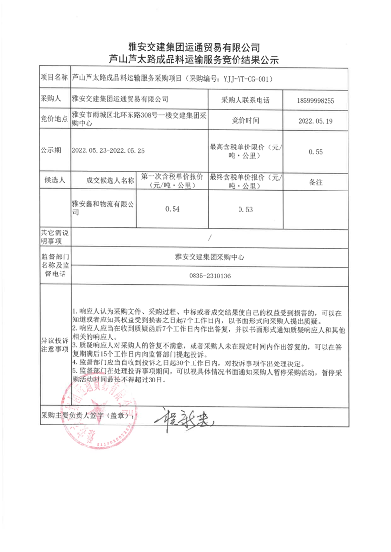 雅安交建集團運通貿(mào)易有限公司蘆山蘆太路成品料運輸服務競價結果公示