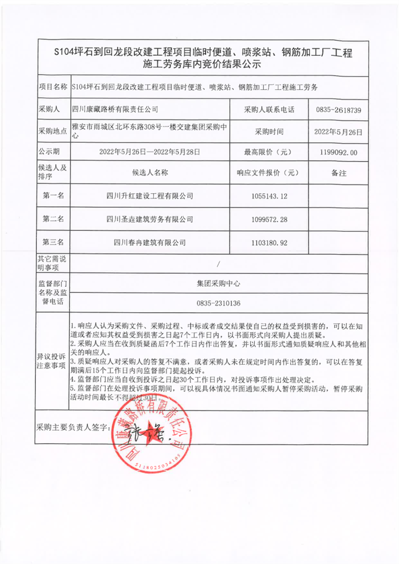 四川康藏路橋有限責(zé)任公司S104坪石到回龍改建工程項目臨時便道、噴漿站、鋼筋加工廠工程施工勞務(wù)庫內(nèi)競價結(jié)果公示