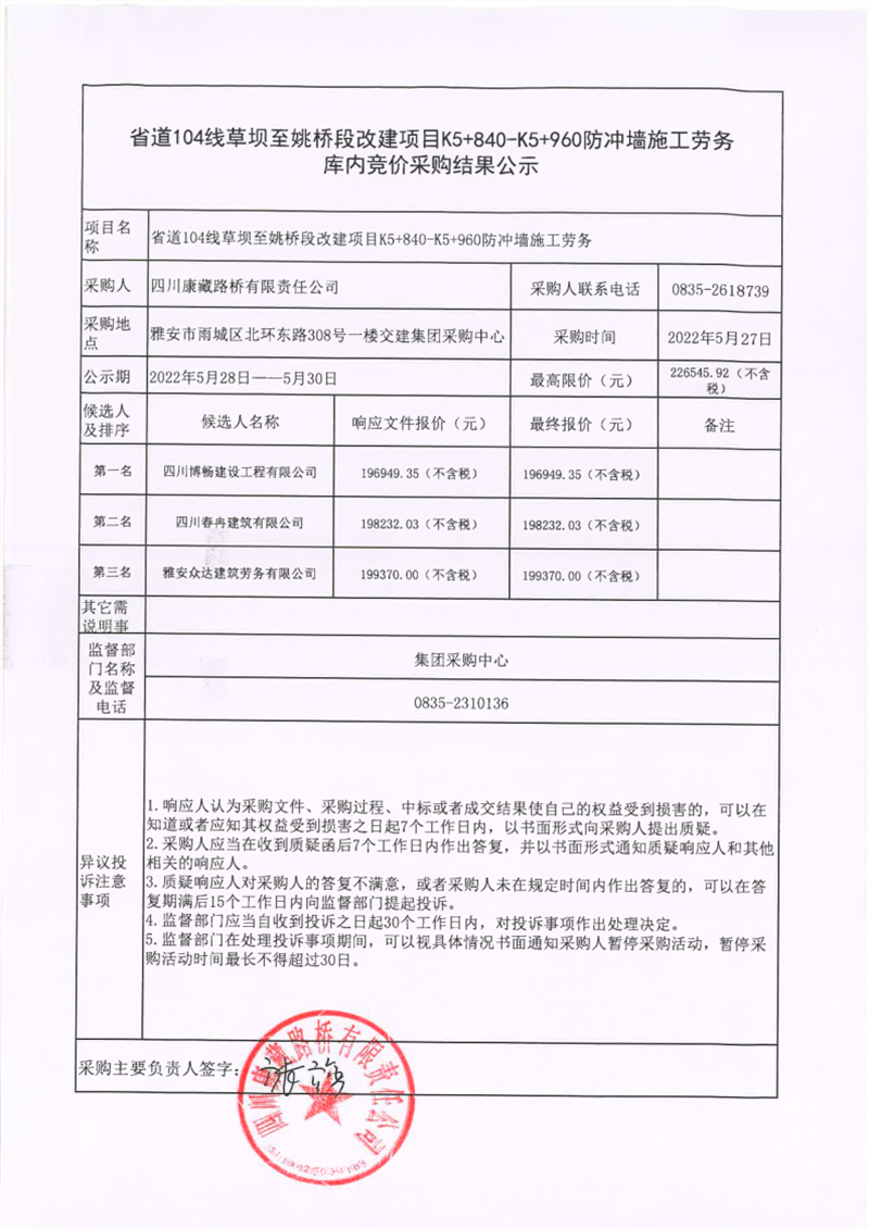 四川康藏路橋有限責(zé)任公司省道104線草壩至姚橋段改建項(xiàng)目K5+840-K5+960防沖墻施工勞務(wù)庫(kù)內(nèi)競(jìng)價(jià)采購(gòu)結(jié)果公示