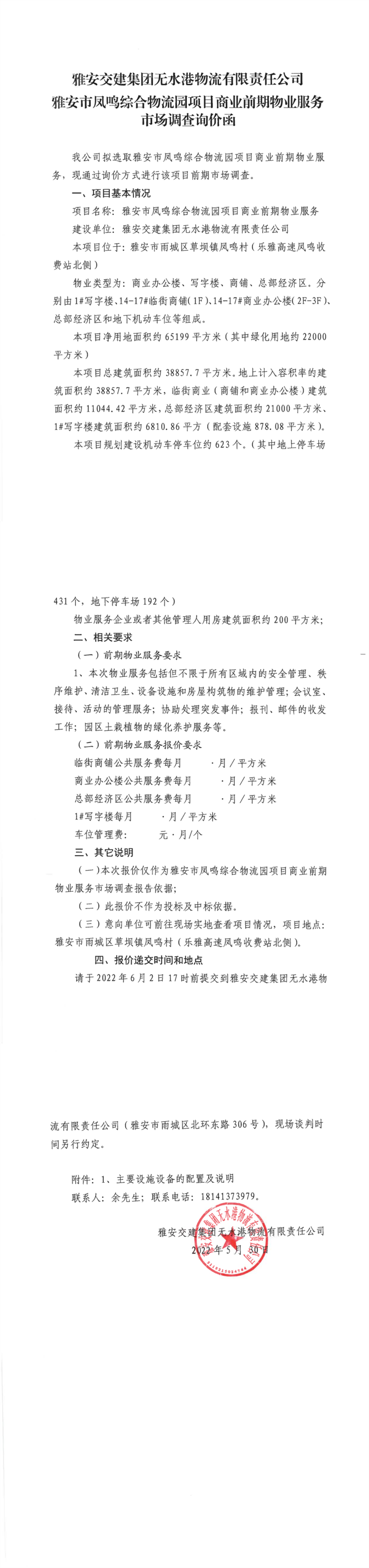 雅安交建集團(tuán)無水港物流有限責(zé)任公司雅安市鳳鳴綜合物流園項(xiàng)目商業(yè)前期物業(yè)服務(wù)市場調(diào)查詢價(jià)函