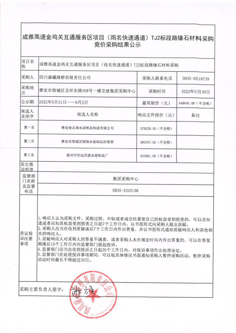 四川康藏路橋有限責任公司成雅高速金雞關(guān)互通服務(wù)區(qū)項目(雨名快速通道)TJ2標段路緣石材料采購競價采購結(jié)果公示