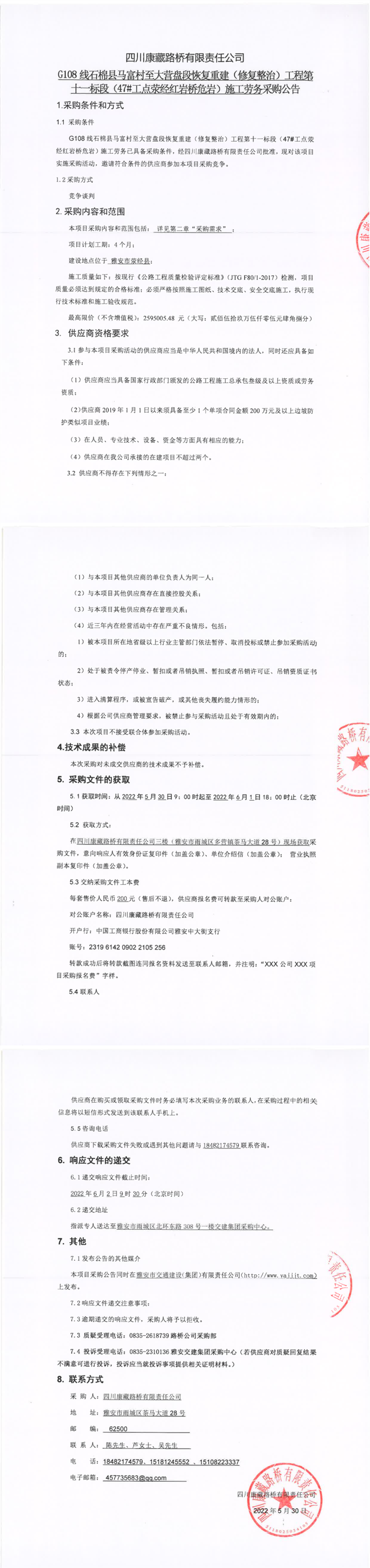 四川康藏路橋有限責(zé)任公司G108線石棉縣馬富村至大營盤段恢復(fù)重建(修復(fù)整治)工程第十一標(biāo)段(47#工點滎經(jīng)紅巖橋危巖)施工勞務(wù)采購公告