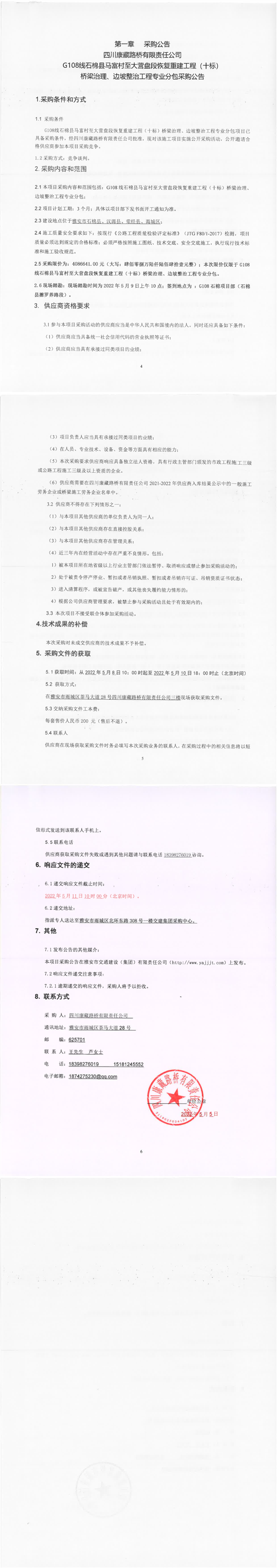 四川康藏路橋有限責(zé)任公司G108線石棉縣馬富村至大營(yíng)盤段恢復(fù)重建工程(十標(biāo))橋梁治理、邊坡整治工程專業(yè)分包采購(gòu)公告
