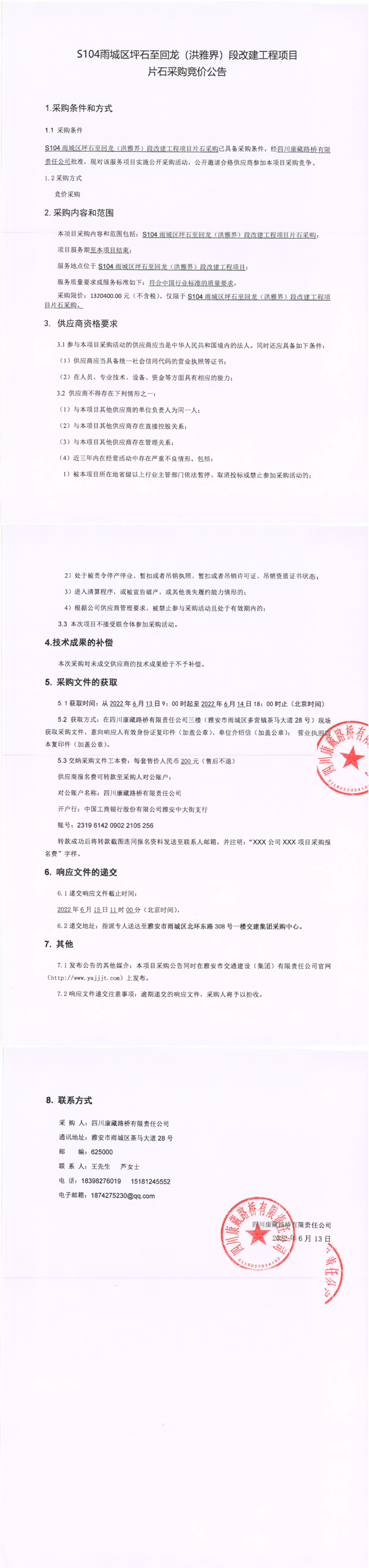 四川康藏路橋有限責(zé)任公司S104雨城區(qū)坪石至回龍(洪雅界)段改建工程項(xiàng)目片石采購競價(jià)公告