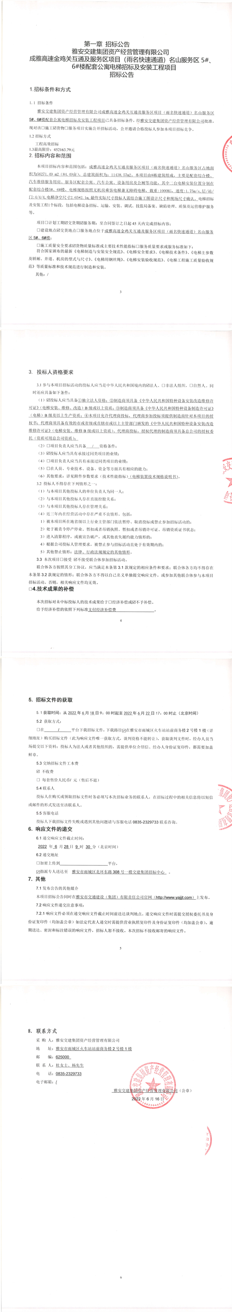 雅安交建集團(tuán)資產(chǎn)經(jīng)營管理有限公司成雅高速金雞關(guān)互通及服務(wù)區(qū)項目(雨名快速通道)名山服務(wù)區(qū)5#、6#樓配套公寓電梯招標(biāo)及安裝工程項目